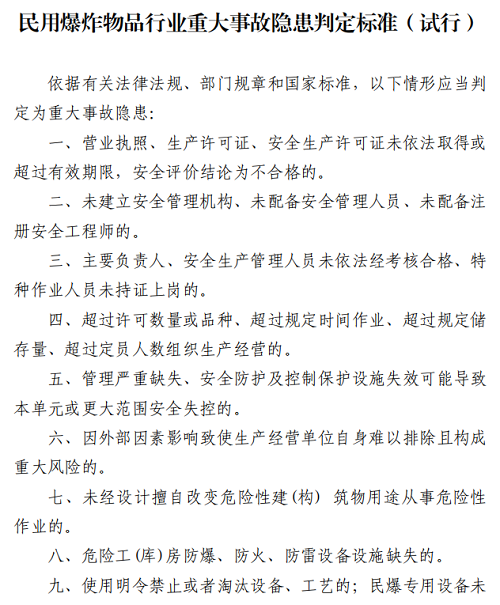 为准确判定、及时整改民用爆炸物品行业重大生产安全事故隐患,有效防范遏制重特大生产安全事故,依据《中华人民共和国安全生产法》和《民用爆炸物品安全管理条例》等法律法规,工业和信息化部制定了《民用爆炸物品行业重大事故隐患判定标准(试行) 》,现印发给你们,请遵照执行。